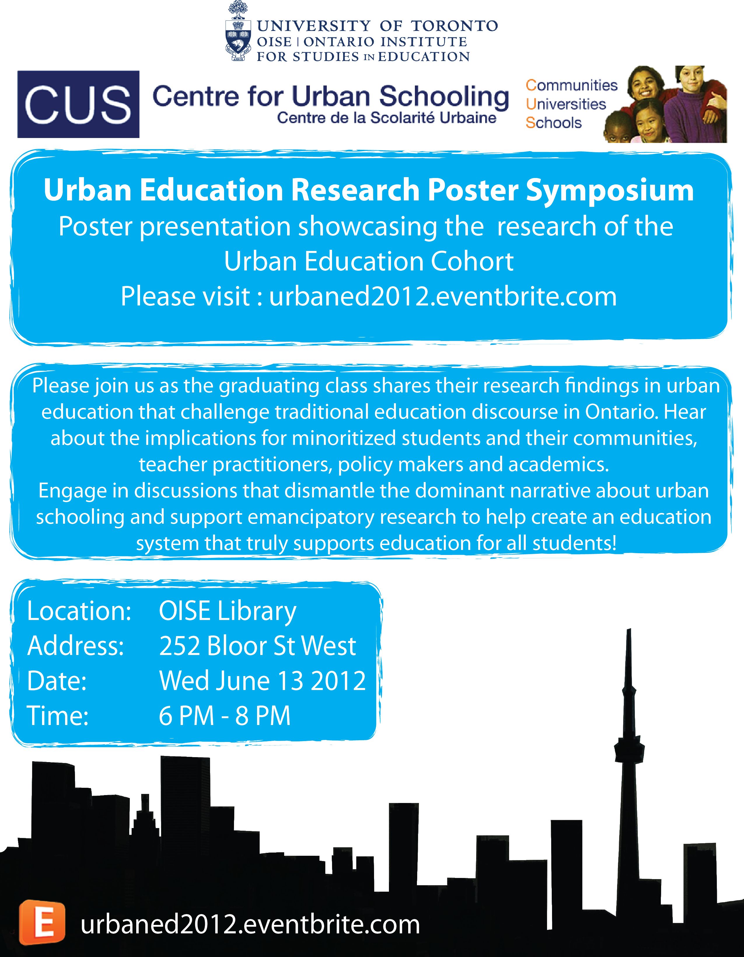 Please join us as the graduating class shares their research findings in urban education that challenge traditional education discourse in Ontario. Hear about the implications for minoritized students and their communities, teacher practitioners, policy makers and academics. Engage in discussions that dismantle the dominant narrative about urban schooling and support emancipatory research to help create an education system that truly supports education for all students!